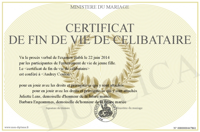 Envoyez par email votre Certificat de fin de vie de célibataire personalisé