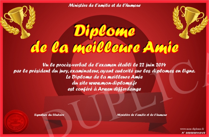 Envoyez par email votre Diplome de la meilleure Amie personalisé