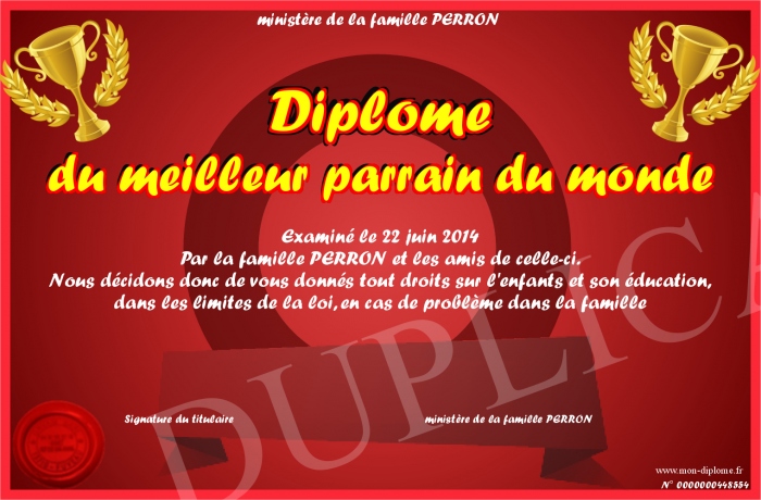 Envoyez par email votre Diplôme du meilleur parrain du monde personalisé
