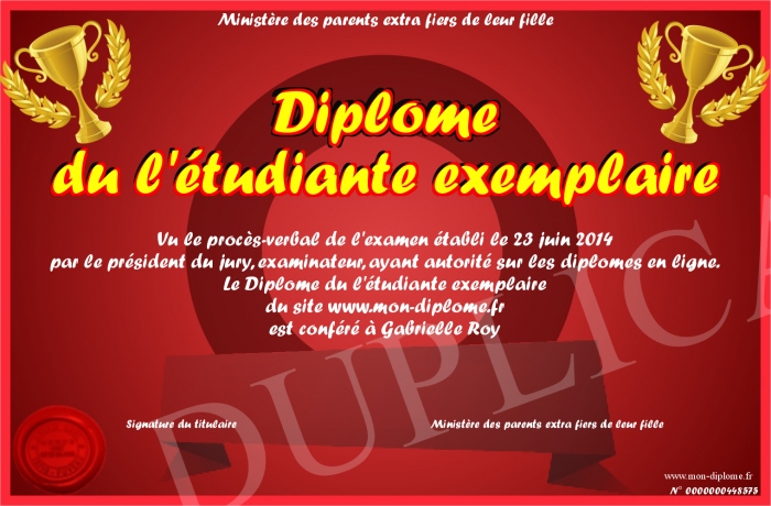 Envoyez par email votre Diplôme du l'étudiante exemplaire personalisé