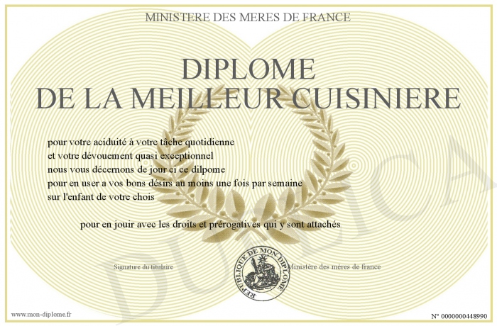 Envoyez par email votre Diplôme de la meilleur cuisinière personalisé
