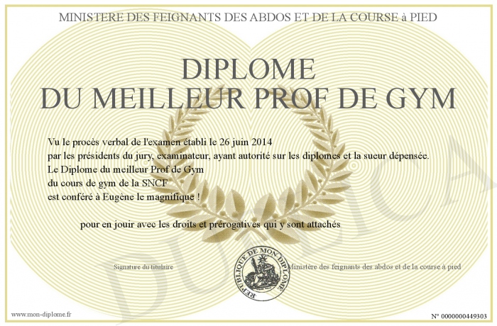 Envoyez par email votre Diplôme du meilleur Prof de Gym personalisé