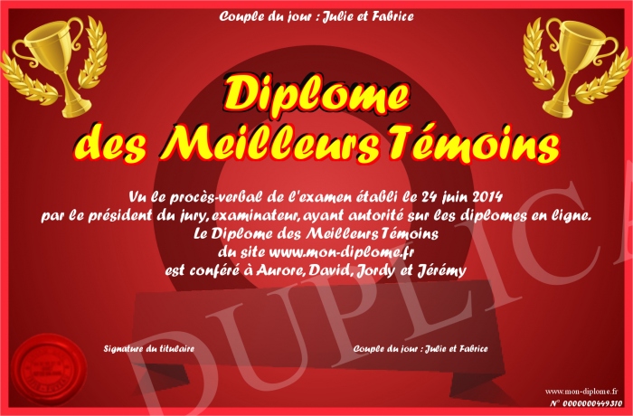 Envoyez par email votre Diplôme des Meilleurs Témoins personalisé