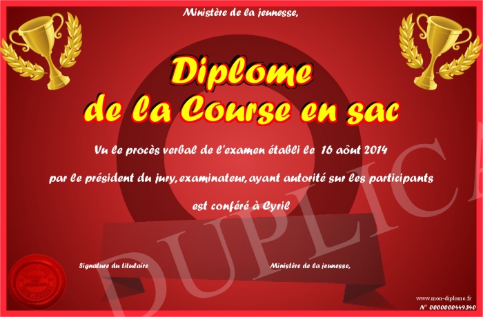 Envoyez par email votre Diplôme de la Course en sac personalisé