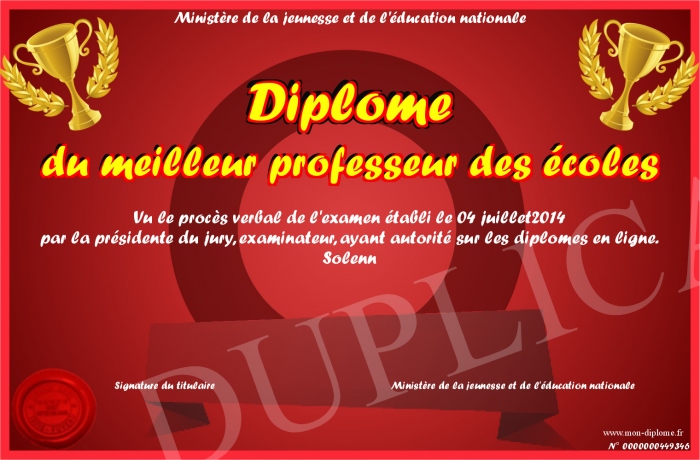 Envoyez par email votre Diplôme du meilleur professeur des écoles personalisé