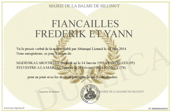 Envoyez par email votre Fiancailles Frédérik et Yann personalisé