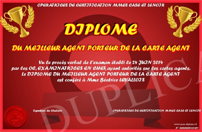 Envoyez par email votre DIPLOME DU MEILLEUR AGENT PORTEUR DE LA CARTE AGENT personalisé