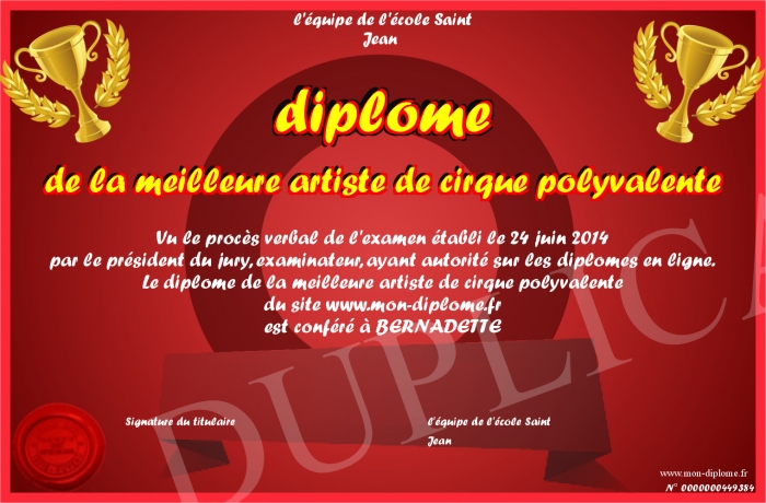 Envoyez par email votre diplôme de la meilleure artiste de cirque polyvalente personalisé