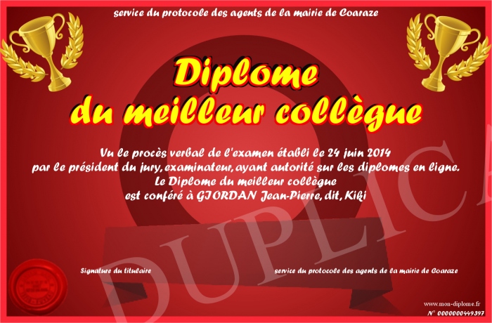 Envoyez par email votre Diplome du meilleur collègue personalisé