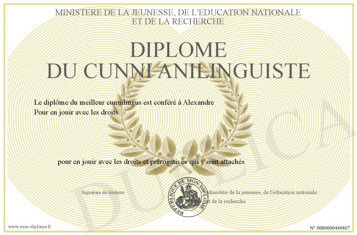 Envoyez par email votre Diplôme du cunni anilinguiste personalisé