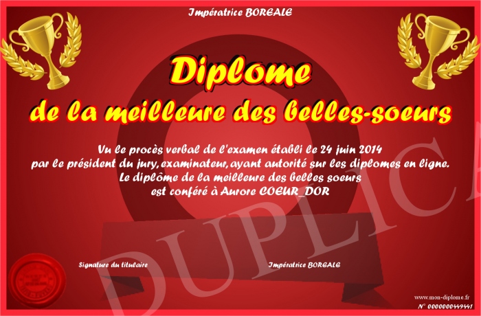 Envoyez par email votre Diplôme de la meilleure des belles-soeurs personalisé