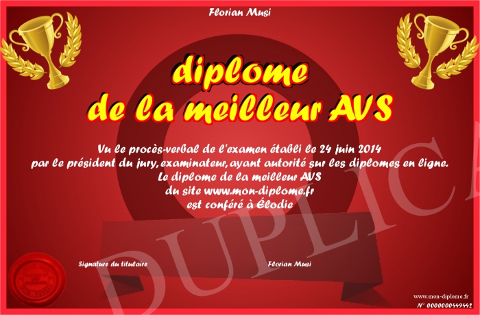Envoyez par email votre diplôme de la meilleur AVS personalisé
