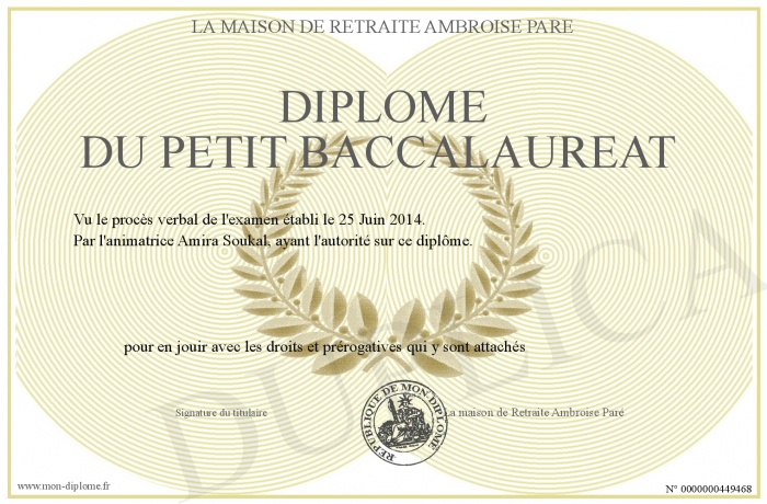 Envoyez par email votre Diplôme du Petit baccalauréat personalisé
