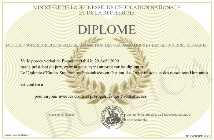Envoyez par email votre Diplome d'Etudes Supérieures Spécialisées en Gestion des Organisations et des ressources Humaines personalisé