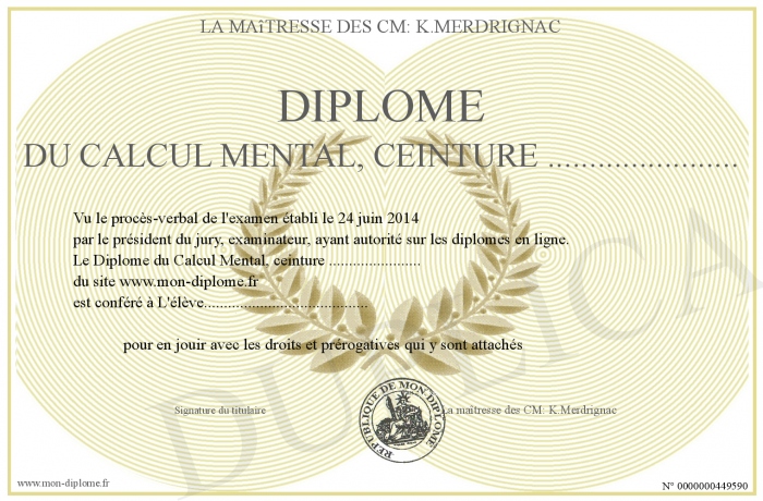 Envoyez par email votre Diplôme du Calcul Mental, ceinture ....................... personalisé