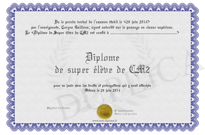 Envoyez par email votre Diplôme de super élève de CM2 personalisé