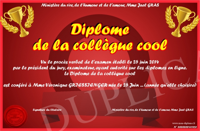 Envoyez par email votre Diplome de la collègue cool personalisé
