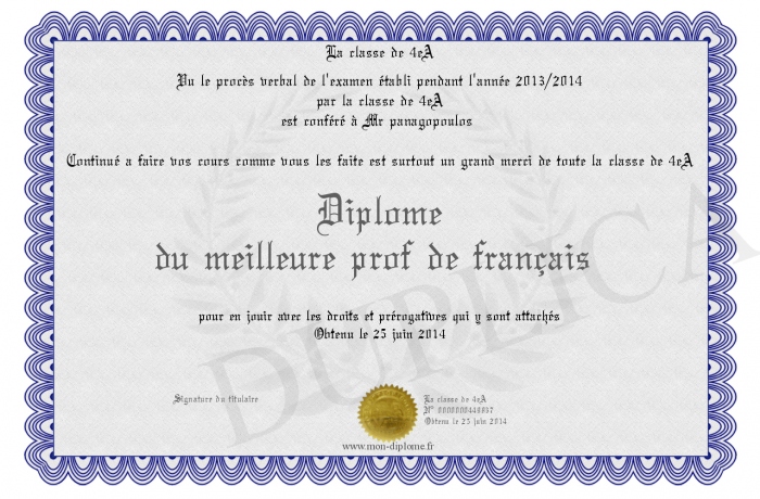 Envoyez par email votre Diplôme du meilleure prof de français personalisé