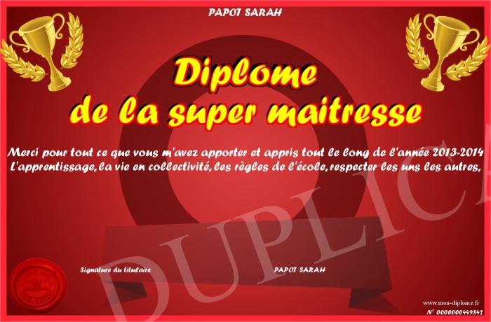 Envoyez par email votre Diplôme de la super maitresse personalisé
