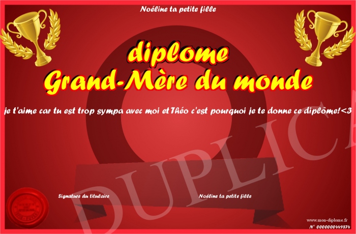 Envoyez par email votre diplôme Grand-Mère du monde personalisé