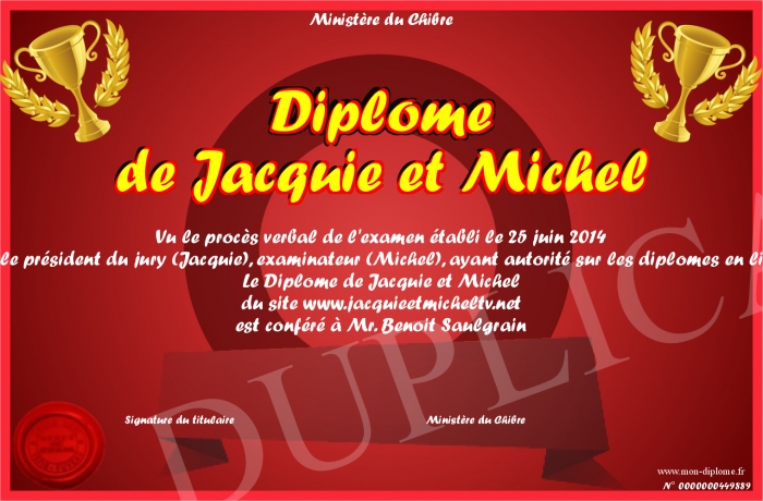 Envoyez par email votre Diplôme de Jacquie et Michel personalisé