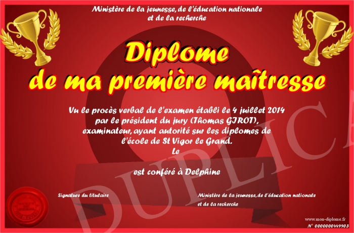 Envoyez par email votre Diplôme de ma première maîtresse personalisé
