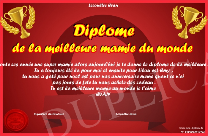 Envoyez par email votre Diplôme de la meilleure mamie du monde personalisé