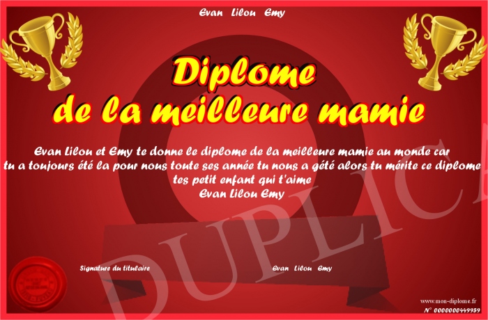 Envoyez par email votre Diplôme de la meilleure mamie personalisé