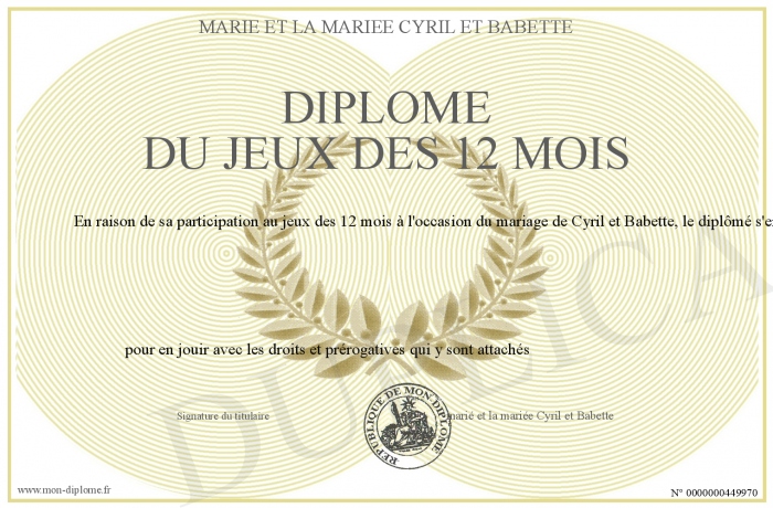 Envoyez par email votre Diplôme du jeux des 12 mois personalisé