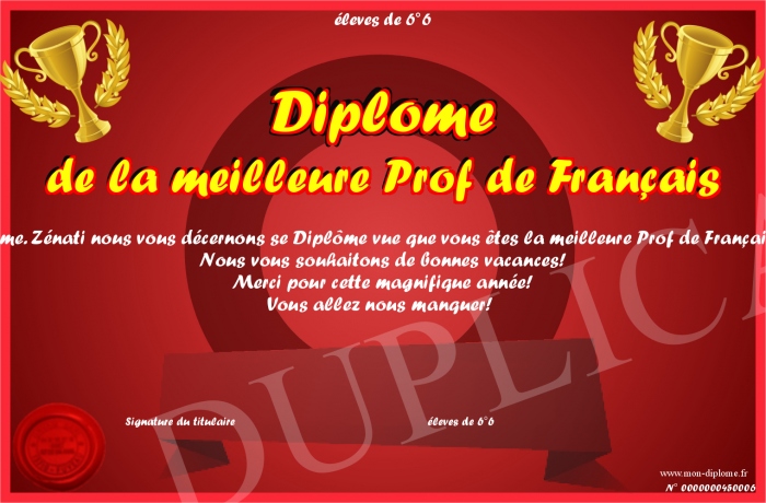 Envoyez par email votre Diplôme de la meilleure Prof de Français personalisé