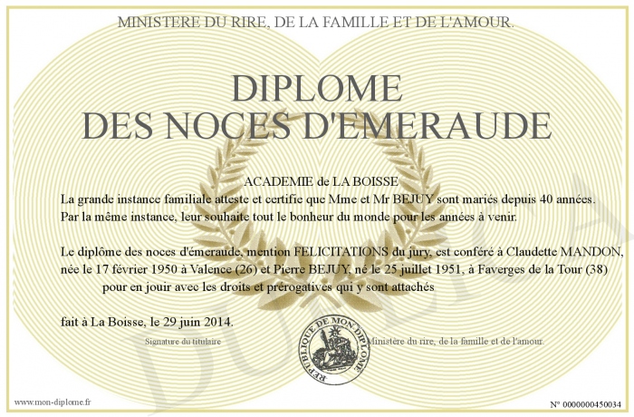 Envoyez par email votre Diplôme des noces d'EMERAUDE personalisé