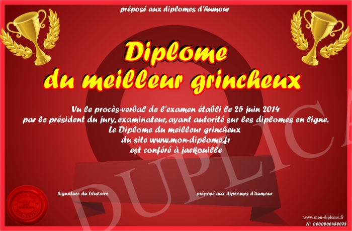 Envoyez par email votre Diplôme du meilleur grincheux personalisé