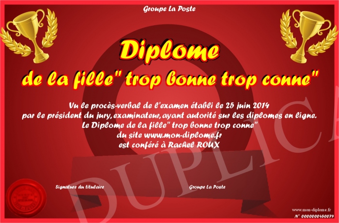 Envoyez par email votre Diplôme de la fille- trop bonne trop conne- personalisé