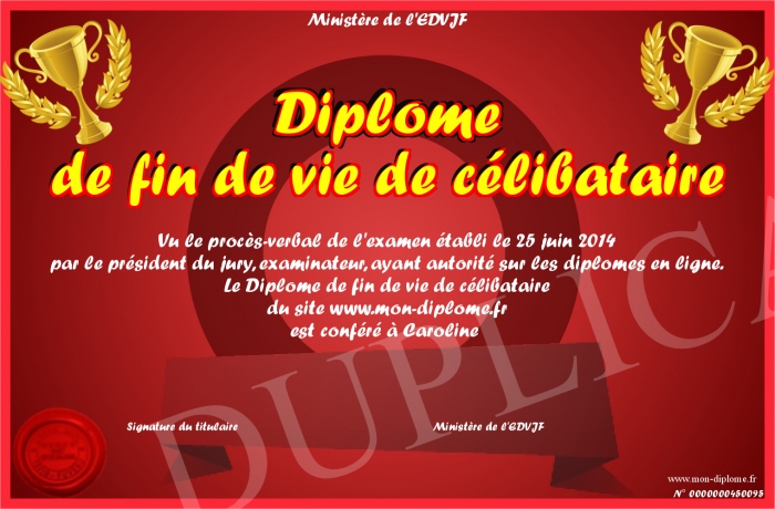 Envoyez par email votre Diplôme de fin de vie de célibataire personalisé