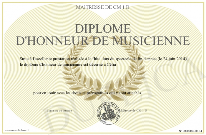 Envoyez par email votre Diplôme d'honneur de musicienne personalisé