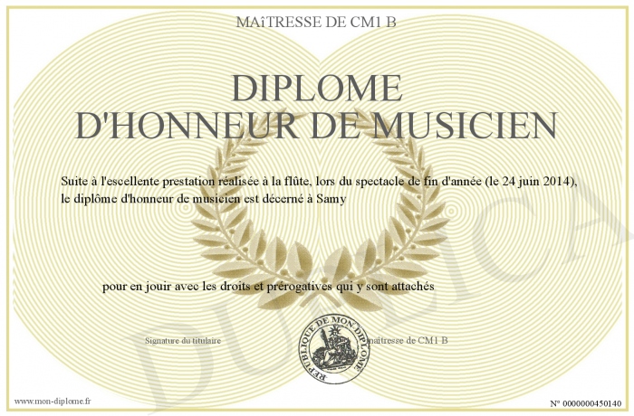 Envoyez par email votre Diplôme d'honneur de musicien personalisé