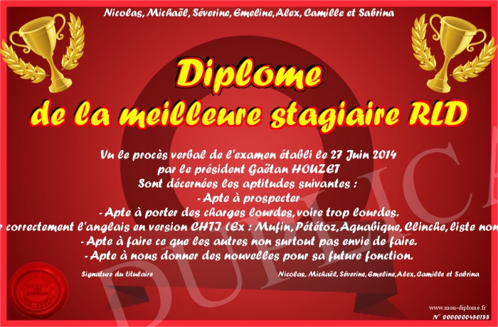 Envoyez par email votre Diplôme de la meilleure stagiaire RLD personalisé