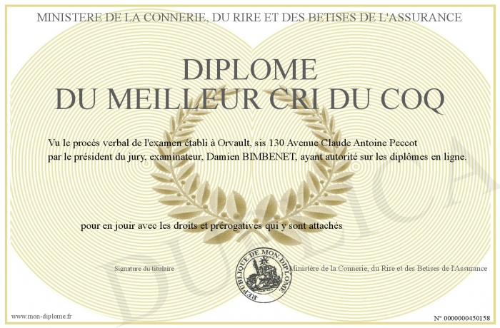 Envoyez par email votre Diplome du meilleur cri du coq personalisé