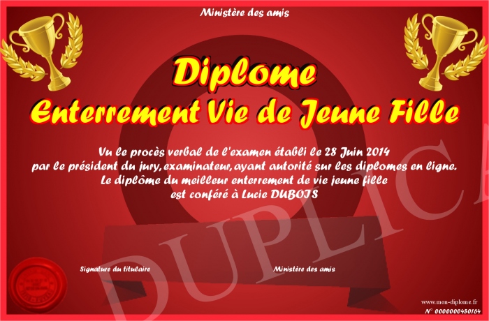 Envoyez par email votre Diplôme Enterrement Vie de Jeune Fille personalisé