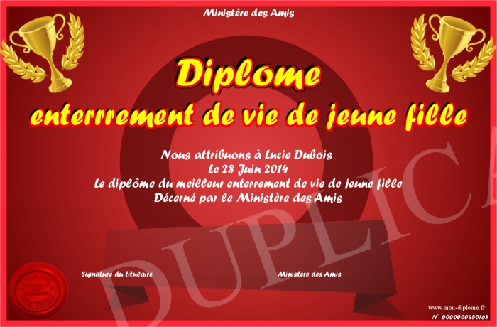 Envoyez par email votre Diplôme enterrrement de vie de jeune fille personalisé