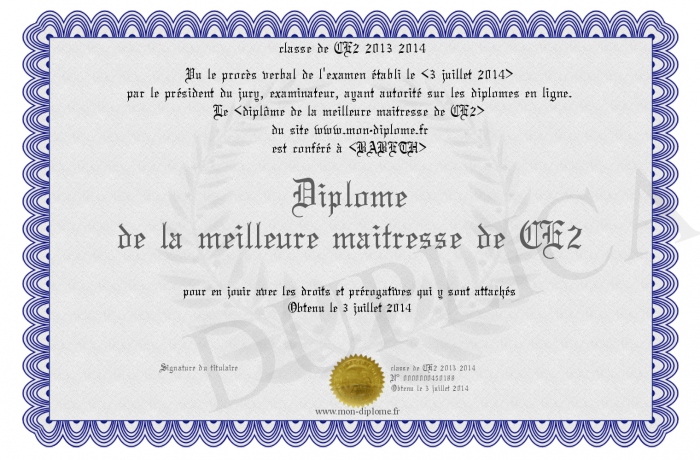 Envoyez par email votre Diplôme de la meilleure maitresse de CE2 personalisé