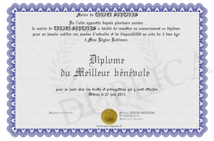 Envoyez par email votre Diplôme du Meilleur bénévole personalisé