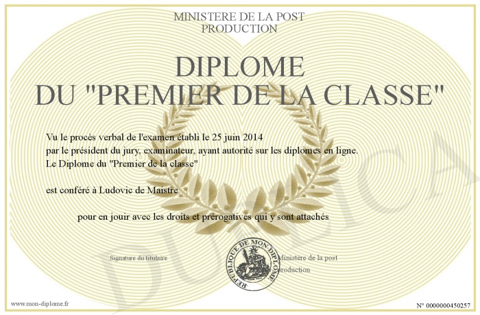 Envoyez par email votre Diplôme du -Premier de la classe- personalisé