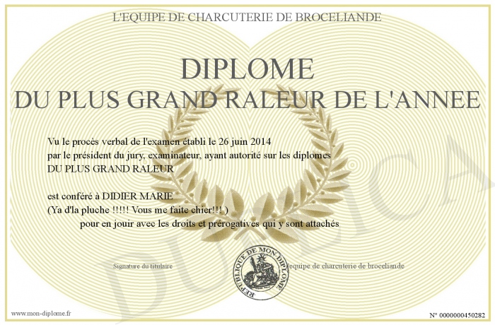 Envoyez par email votre Diplôme du plus grand raleur de l'année personalisé