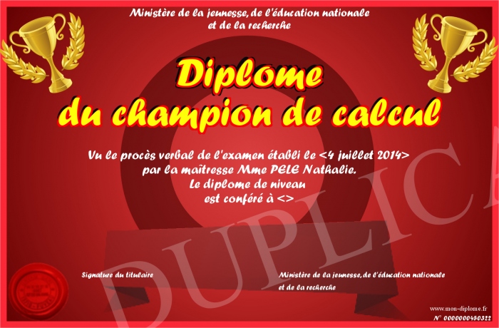 Envoyez par email votre Diplôme du champion de calcul personalisé
