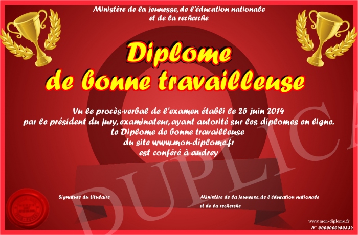 Envoyez par email votre Diplôme de bonne travailleuse personalisé
