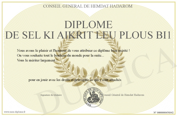 Envoyez par email votre Diplôme de sel ki aikrit leu plous bi1 personalisé
