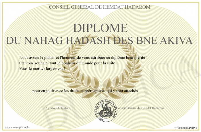 Envoyez par email votre Diplôme du nahag hadash des bné Akiva personalisé