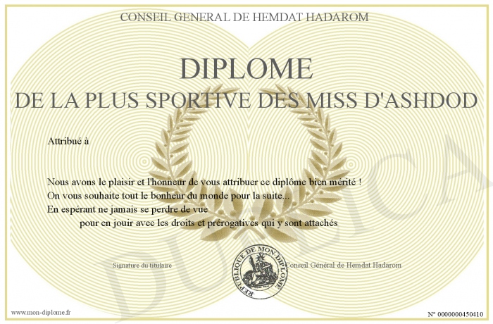 Envoyez par email votre Diplôme de la plus sportive des miss d'Ashdod personalisé