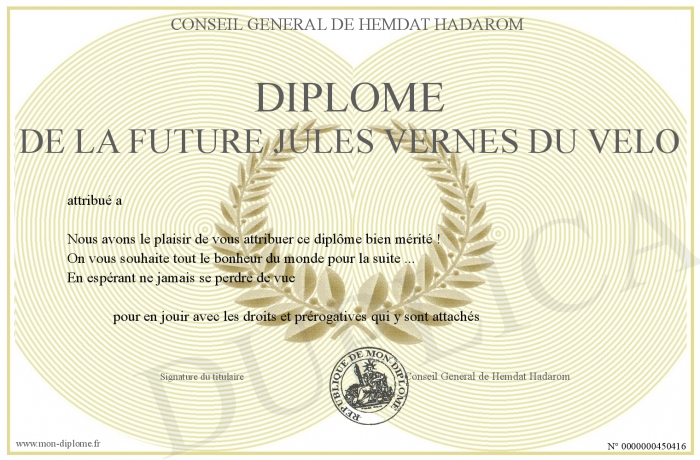 Envoyez par email votre Diplôme de la future Jules Vernes du Velo personalisé
